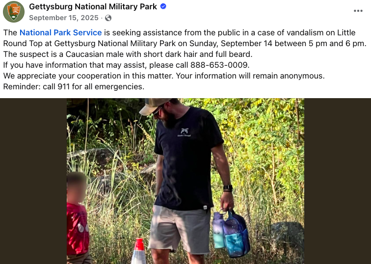 On Sept. 14, 2025, National Park Service rangers received a report of an adult male using a knife to carve his initials into a monument on Little Round Top. An investigation determined that the initials “LJR” were carved into the plaque of the 44th New York Infantry Monument and into the face of Colonel Patrick O’Rorke on the 140th New York Infantry Monument.