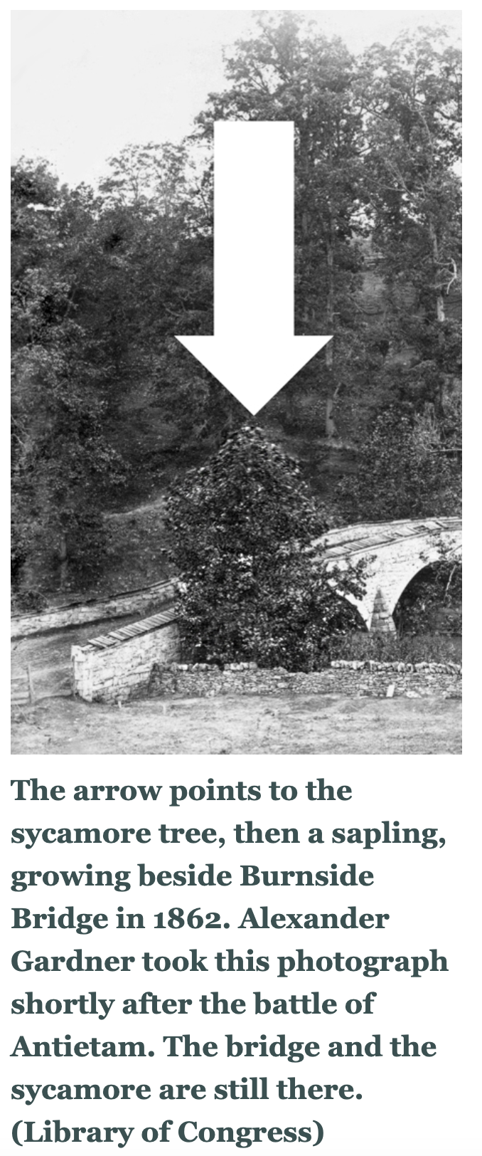 A day or two or three after the battle, Alexander Gardner photographed Burnside Bridge from a spot slightly to the north. The photograph captured the surrounding terrain and trees, including a sycamore growing beside the bridge’s eastern entrance.