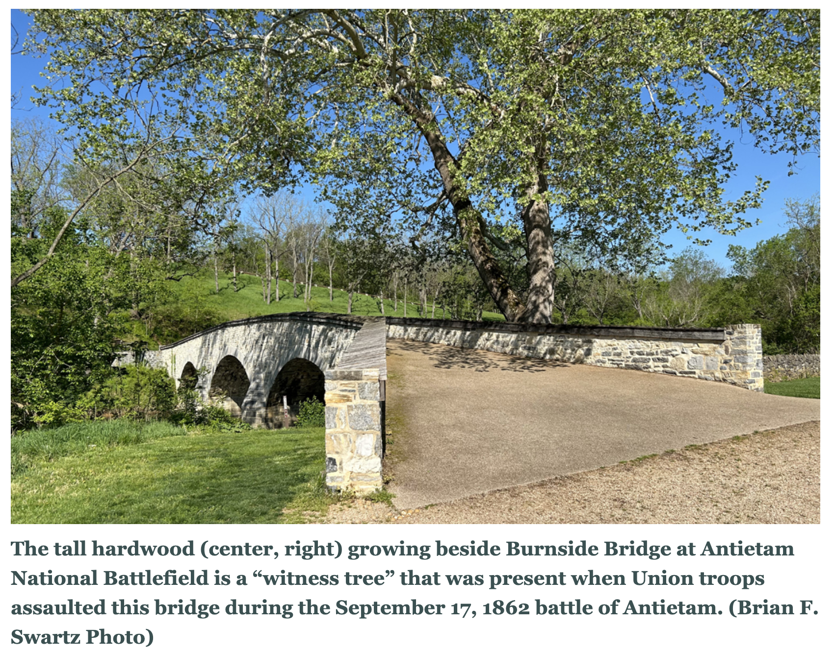 That tree became the Burnside Sycamore. Years passed, the land around Burnside Bridge became federal property, and people explored the bridge and the battlefield.