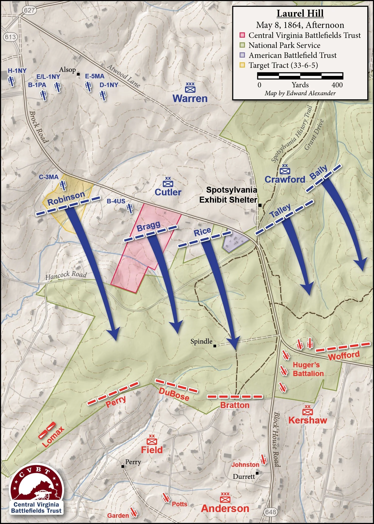 After the Wilderness stalemate, Grant moved toward Spotsylvania Court House using the Brock Road. On May 8, 1864, Union forces advanced over this tract after fighting at Todd’s Tavern. Confederate cavalry under Gen. Fitzhugh Lee delayed the Federals before falling back, and Union infantry assaults against Laurel Hill were repulsed throughout the day. That evening, Col. Henry Brown’s New Jersey brigade also failed to break Gen. Richard H. Anderson’s line.